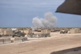 В Сети появилось видео, на котором американский военный фиксирует удар иранского дрона-камикадзе по стоянке техники на базе США в Кувейте.